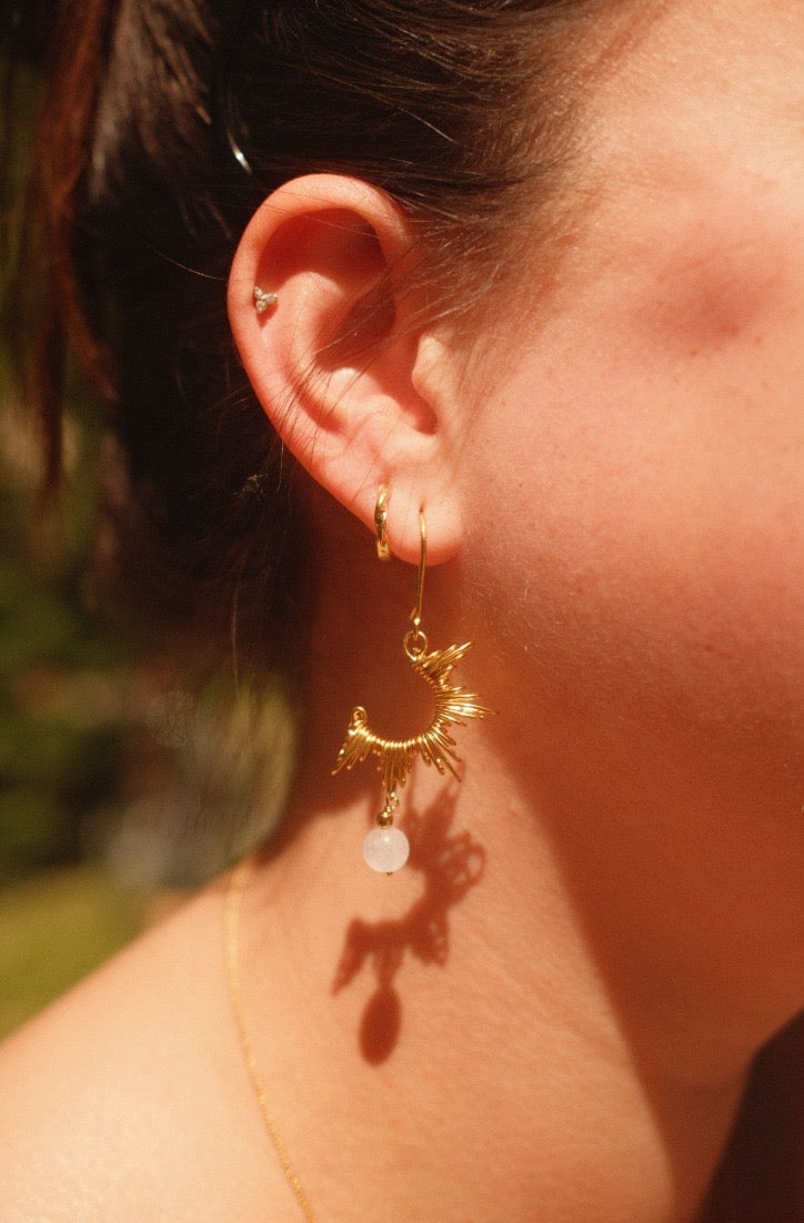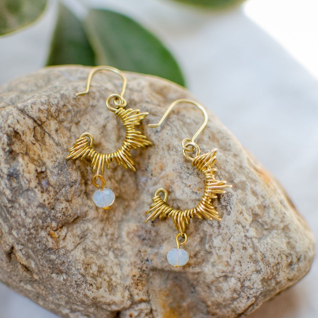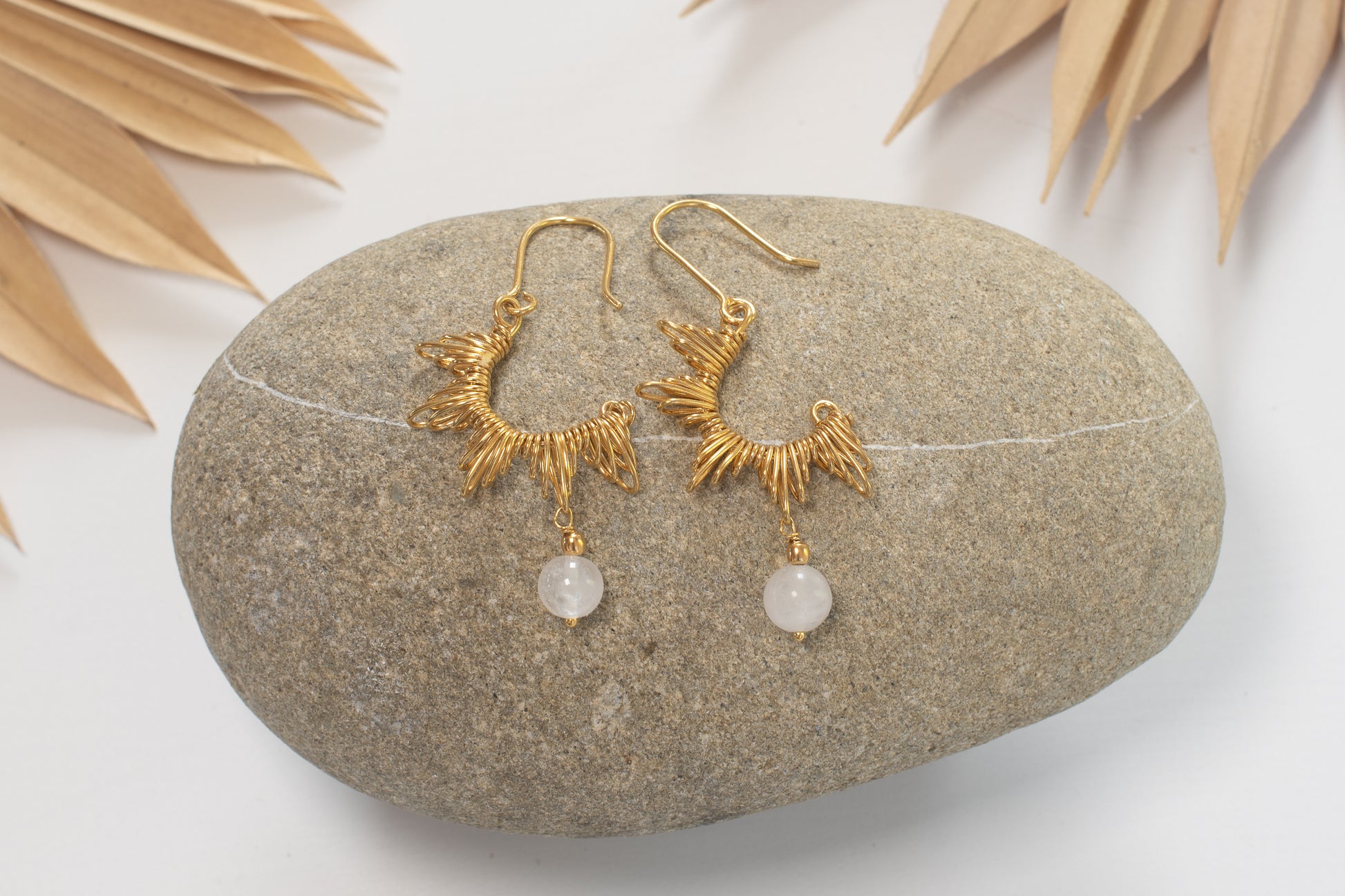 Halve maan-oorbellen met Maansteen en 14k goldplated draad, liefdevol handgemaakt, met een steen die geluk en bescherming biedt.