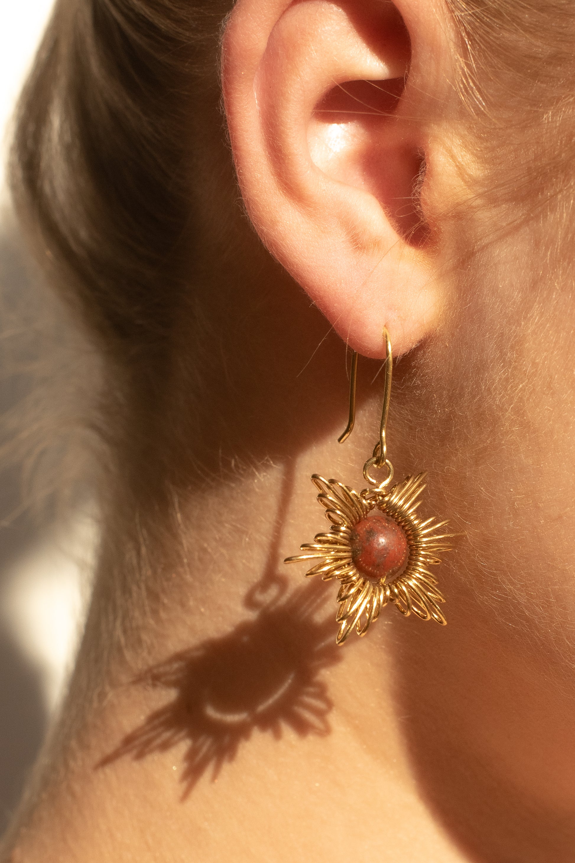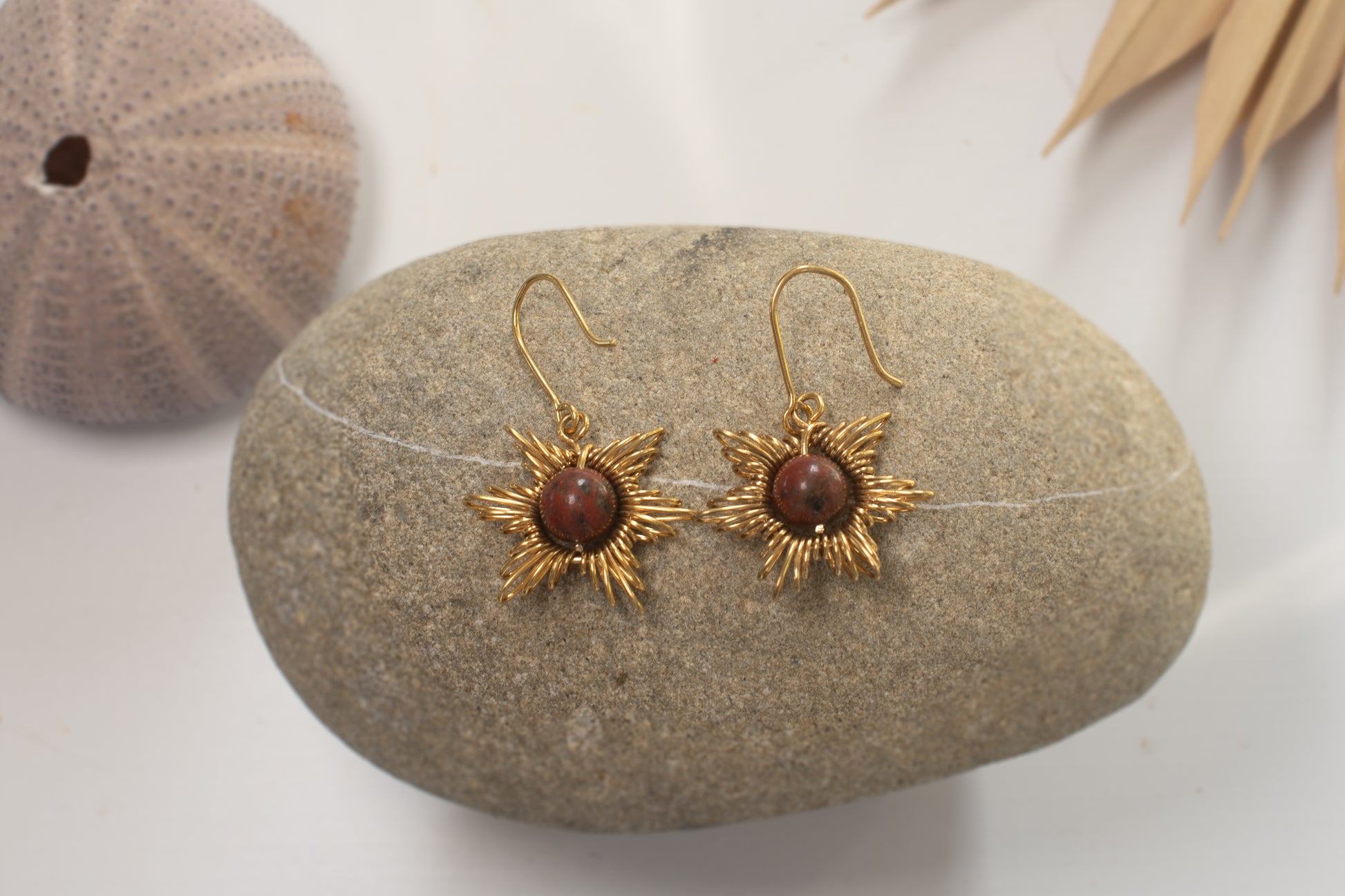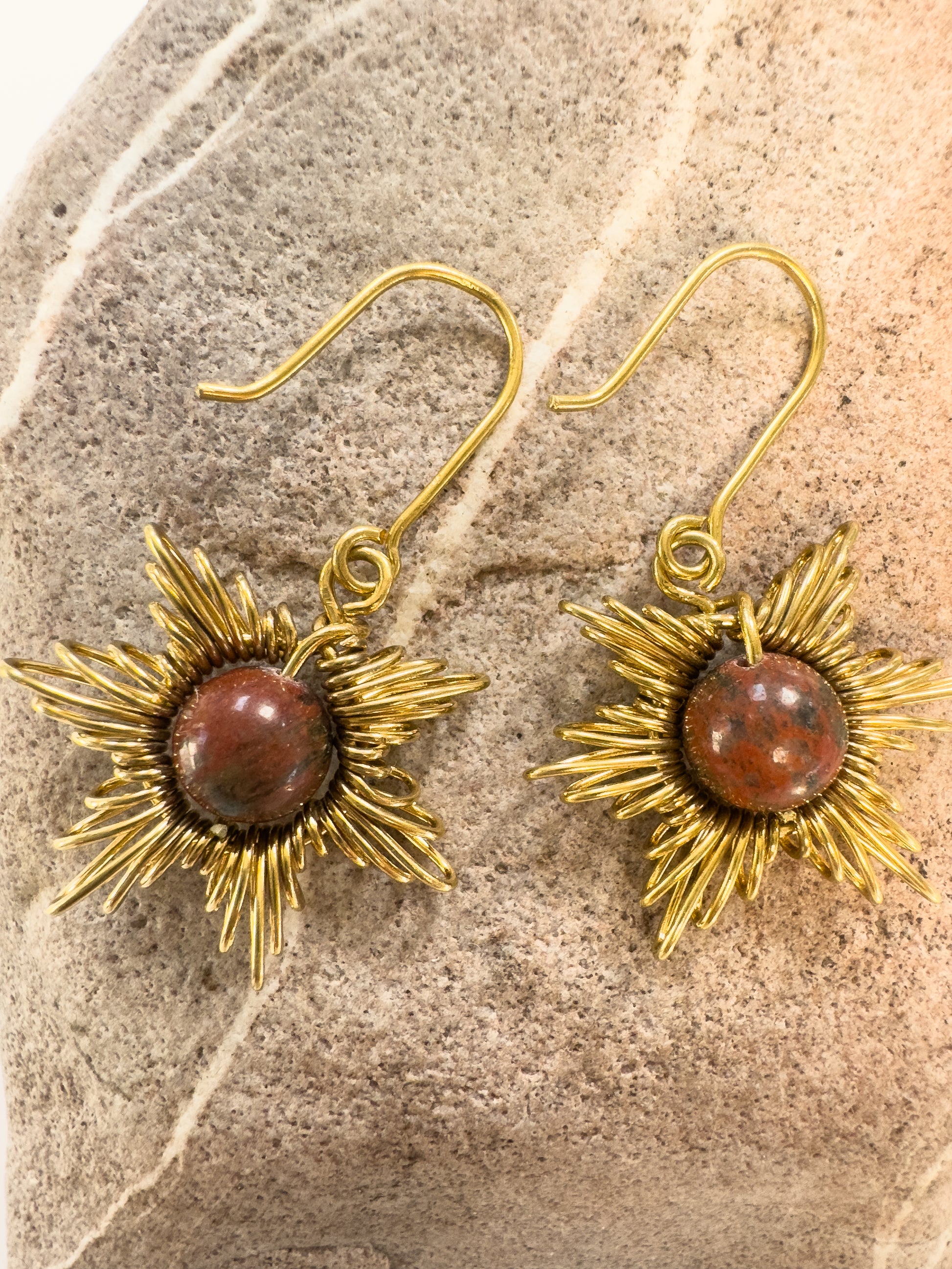 Handgemaakte zonvormige oorbellen van 14k goldplated draad, met een Tijgeroog als accent, bekend om het vergroten van zelfvertrouwen en het aantrekken van succes.